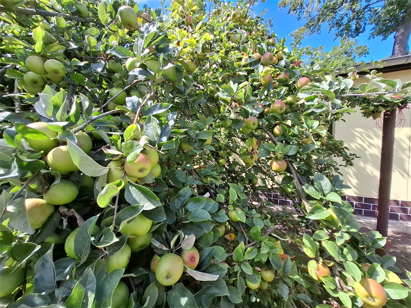 Der pflegeleichte Garten ist eine kleine Wiese mit Apfelbaum und Haselnussstrauch. Das Grundstück ist vollständig eingezäunt und bietet damit Privatsphäre und Sicherheit.