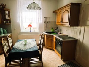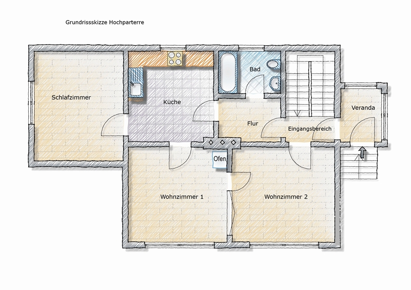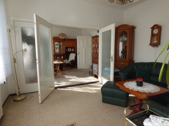 Hochparterre ca. 89 m² - beheizte Veranda, zwei Wohnzimmer mit 3-flügeliger Verbindungstür, helles Schlafzimmer, Küche mit Essbereich, kleines Wannenbad, Flur und Hausflur