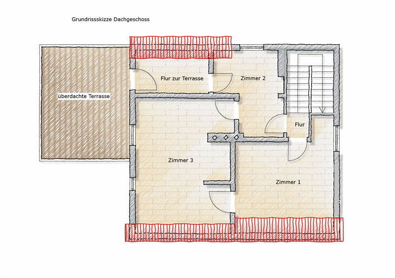 Dachgeschoss ca. 59 m² - 2 geräumige Zimmer, 1 kleines Durchgangszimmer (früher Küche) und überdachte Terrasse